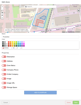 - Optionally, you can assign a colour to the zone and activate and define additional attributes in the field Properties.